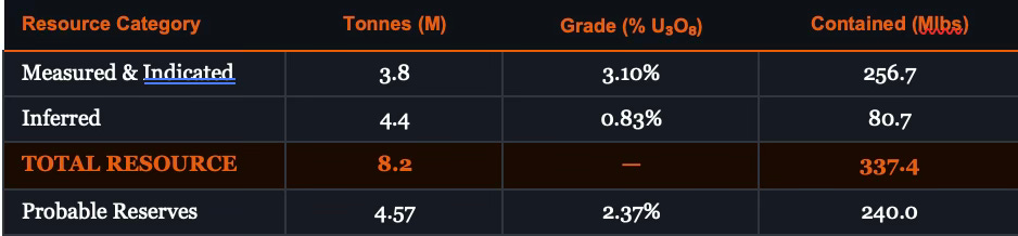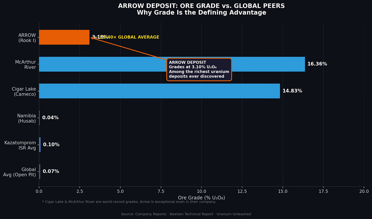 The average open-pit uranium mine grades around 0.05–0.10% U₃O₈. Arrow’s measured and indicated resource grades at 3.10% — that is 25 to 40 times richer than the global average. There is almost no equivalent on Earth outside the Athabasca Basin itself.