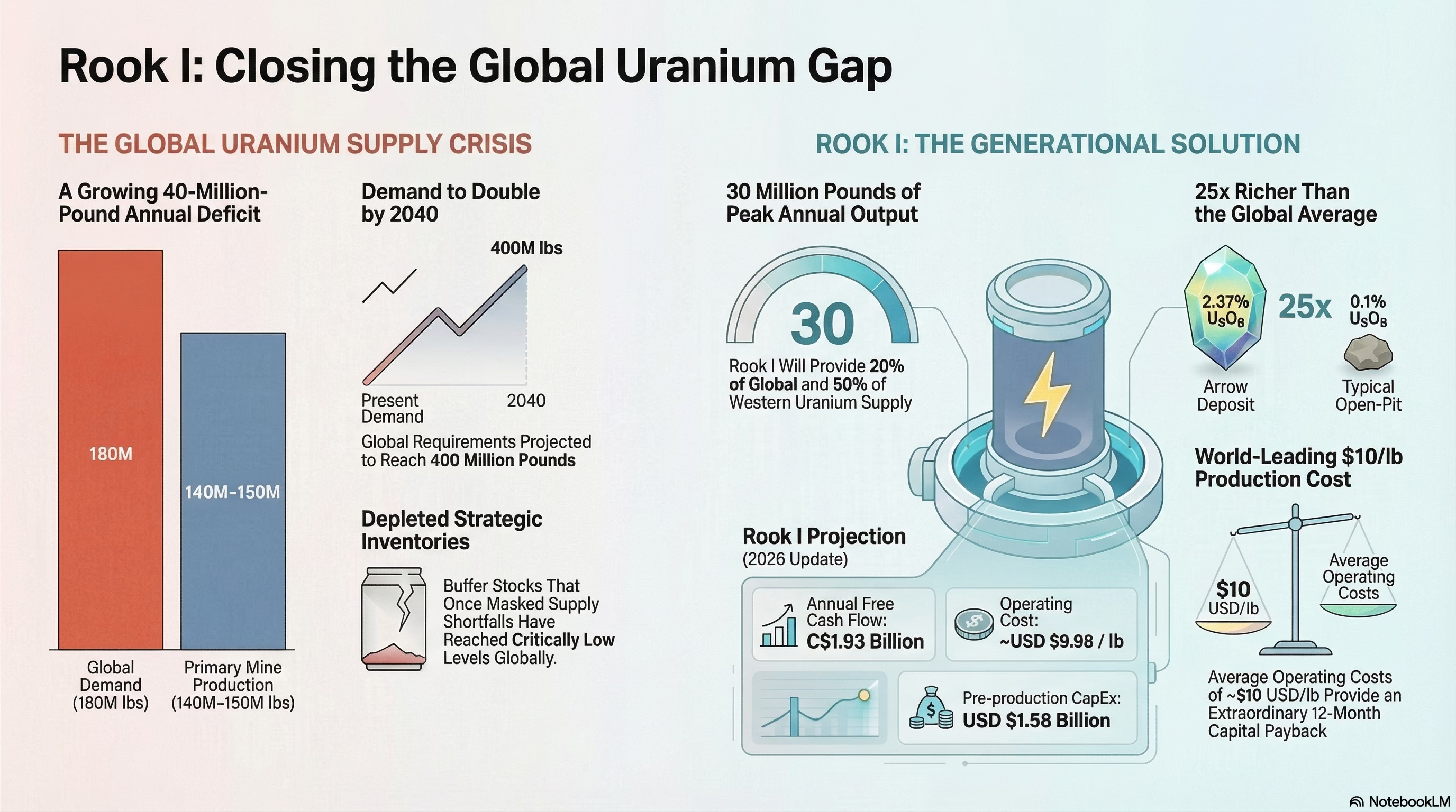Picture this: the world is burning 180 million pounds of uranium every year. Mines are only producing 140–150 million pounds. That gap — 30 to 40 million pounds of annual deficit — gets papered over by drawing down stockpiles that are not going to last forever.