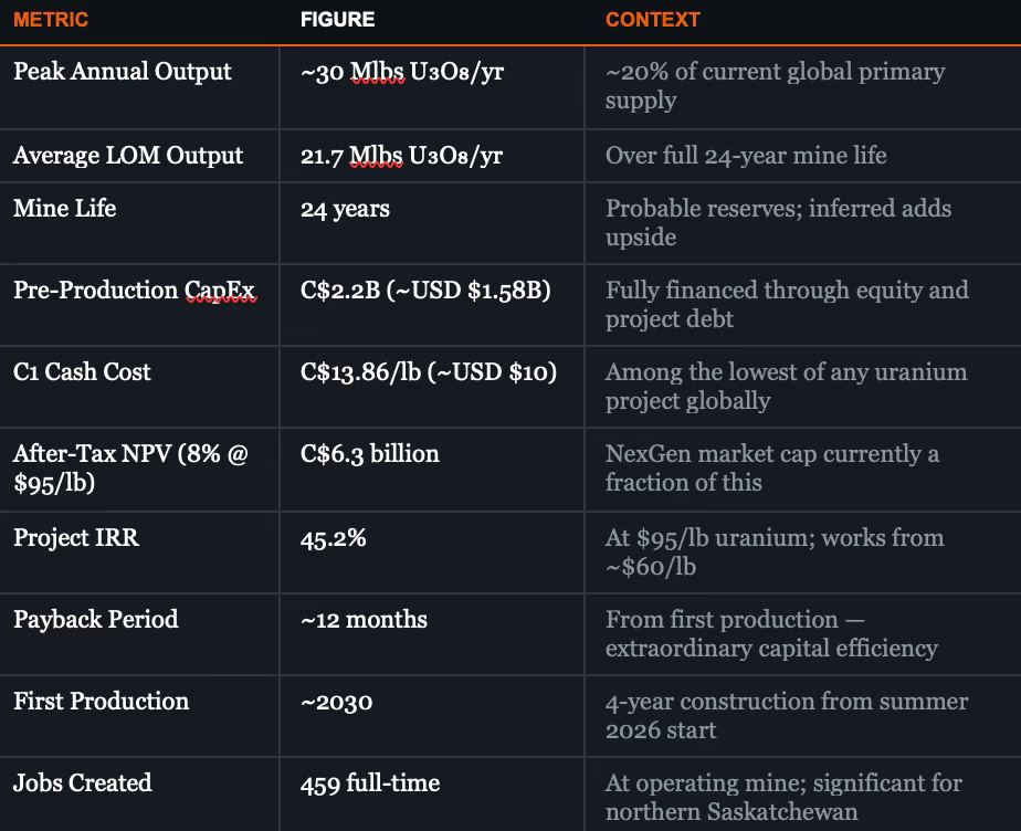 NexGen immediately announced a Final Investment Decision. Construction begins summer 2026. First production is targeted for approximately 2030. The project sits in the Athabasca Basin of northern Saskatchewan — the same geological belt that produced Cigar Lake and McArthur River, the two highest-grade uranium mines ever operated anywhere on Earth.
