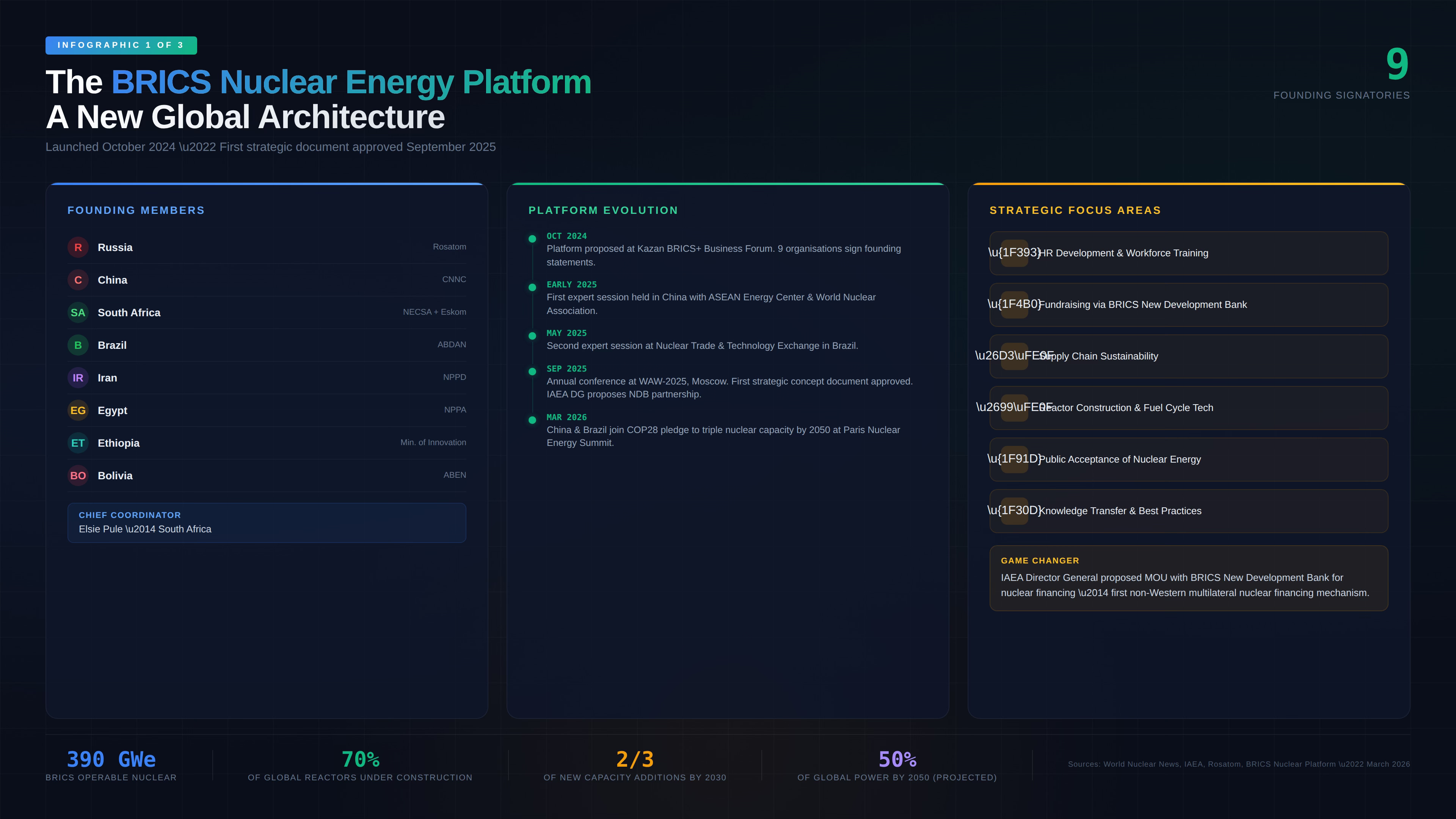 Nine organisations from BRICS member and partner states signed founding statements supporting the Platform’s creation. These included Russia’s Rosatom, China’s CNNC (China National Nuclear Corporation), South Africa’s NECSA and Eskom Holdings, Brazil’s ABDAN (the national nuclear industry association), Iran’s NPPD (Nuclear Power Production and Development Company), Egypt’s NPPA (Nuclear Power Plants Authority), Ethiopia’s Ministry of Innovation and Technology, and Bolivia’s ABEN (Agencia Boliviana de Energía Nuclear). The Platform’s Chief Coordinator is Elsie Pule of South Africa — a significant choice indicating the initiative aims to position African and Global South nations as central stakeholders rather than passive recipients of technology.