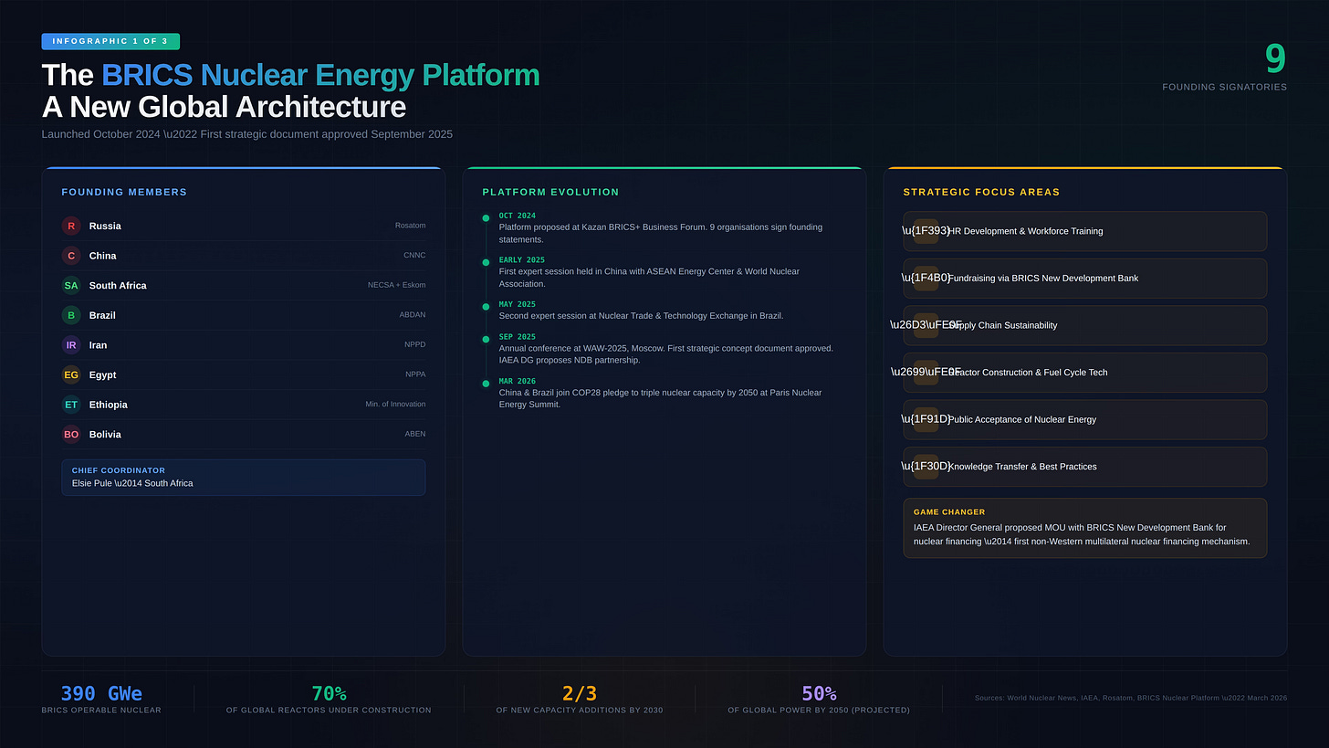 This report examines the origins, structure, key players, active projects, financing mechanisms, and strategic significance of the BRICS nuclear cooperation drive. It draws on verified data from peer-reviewed academic journals, institutional analyses from CSIS and the Wilson Center, reporting from Reuters and World Nuclear News, and official communications from Rosatom, CNNC, and the IAEA.